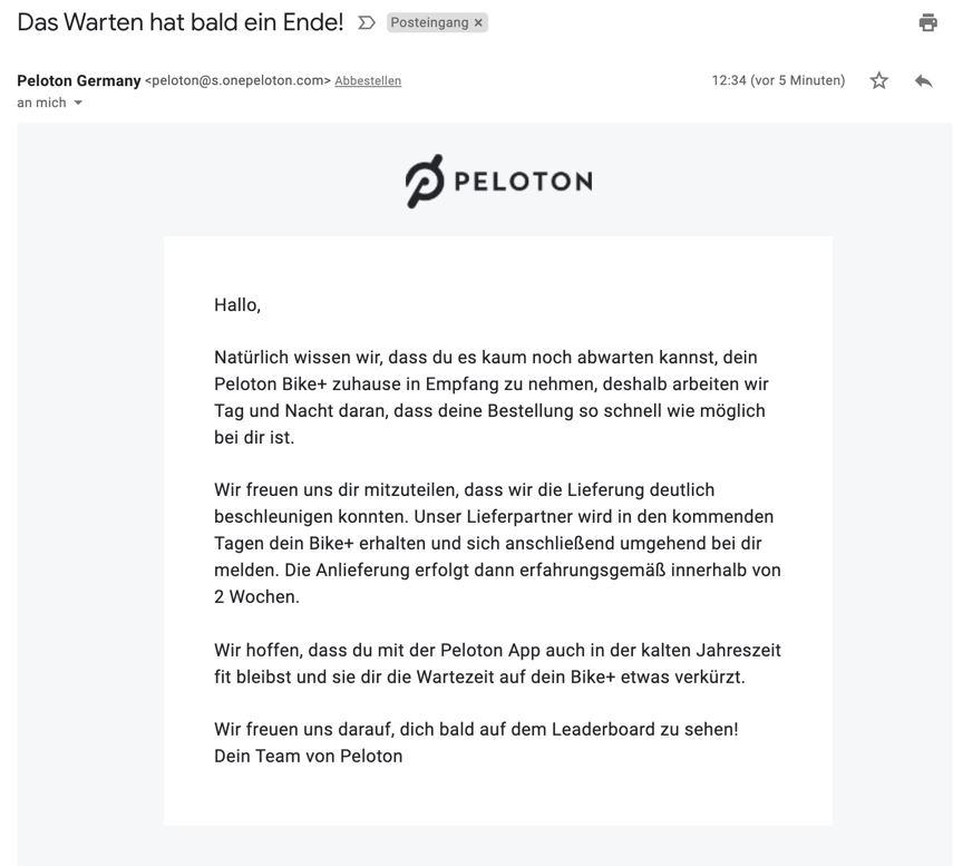 ZitatAlles anzeigenHallo Nico, Wir schreiben dir, um dich bezüglich deiner letzten Bestellung bei Peloton auf dem Laufenden zu halten.