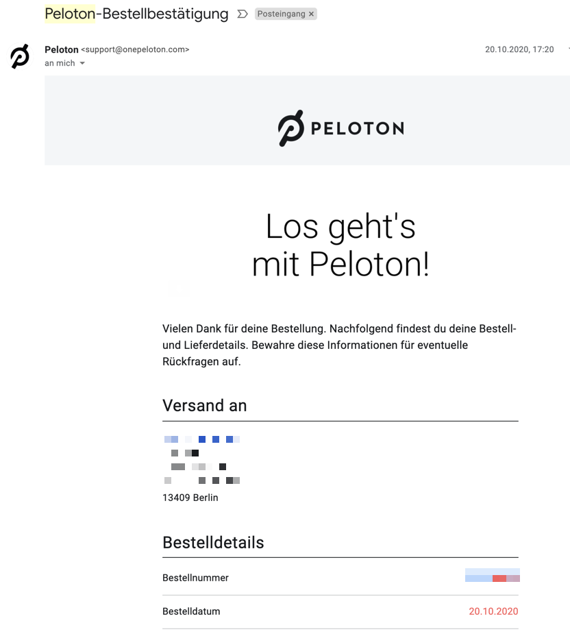 1) Schaut in Euren Mails nach der Bestellbestätigung von Peloton und sucht dort Eure Bestellnummer und kopiert sie (das Format ist XXXX-XXXX):