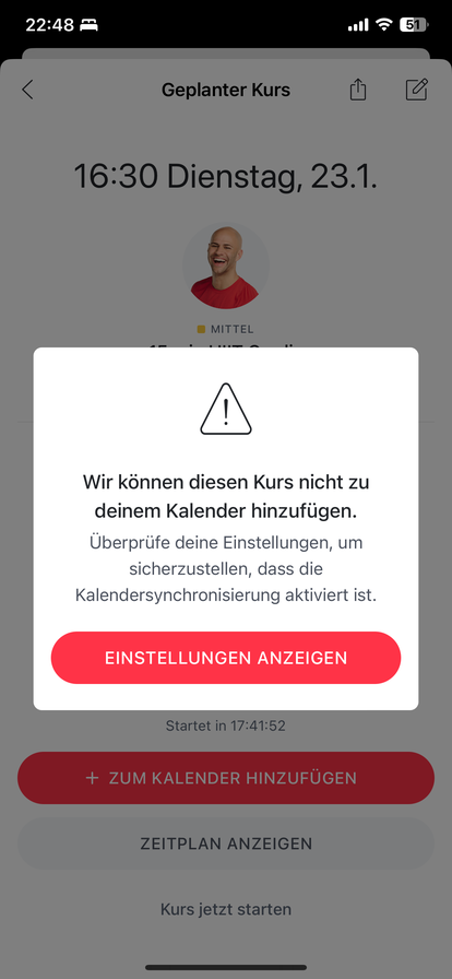 „Wir können diesen Kurs nicht zu deinem Kalender hinzufügen. Überprüfe deine Einstellungen, um sicherzustellen, dass die Kalendersynchronisierung aktiviert ist“