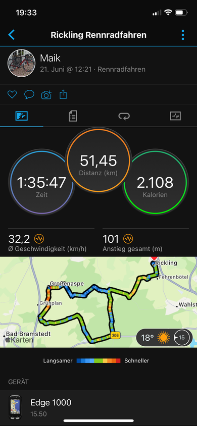 Leider komme ich zur Zeit kaum zum indoor oder Outdoor fahren, haben zur Zeit unser Poolbauprojekt die Poolbauer sind heute fertig geworden aber ist trotzdem noch genug zu tun. Aber darum gehts ja nicht, als ich das letzte mal mit dem Rennrad unterwegs war stimmte die Aufzeichnung mit der Peloton App nicht richtig. Die Kilometer und Durchschnittsgeschwindigkeit stimmt der Score wert aber überhaupt nicht 0,2 scheint so als ob er die Strecke auch nicht komplett aufgezeichnet hat obwohl die Kilometer stimmen. Anbei mal die Bilder von der Peloton App und vom Garmin.