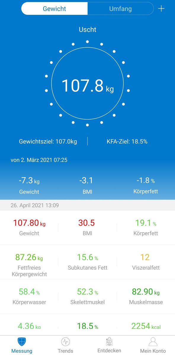 Hier die Daten meiner Waage mit Stand heute morgen: