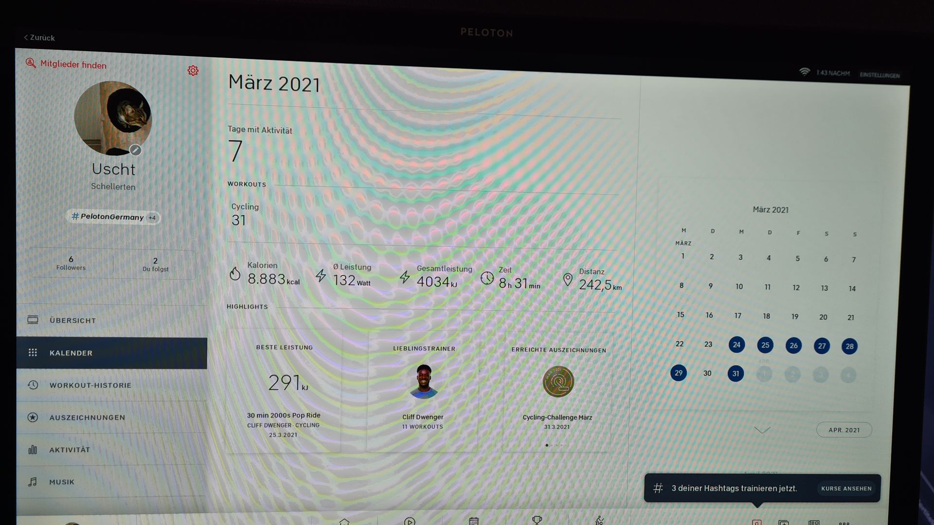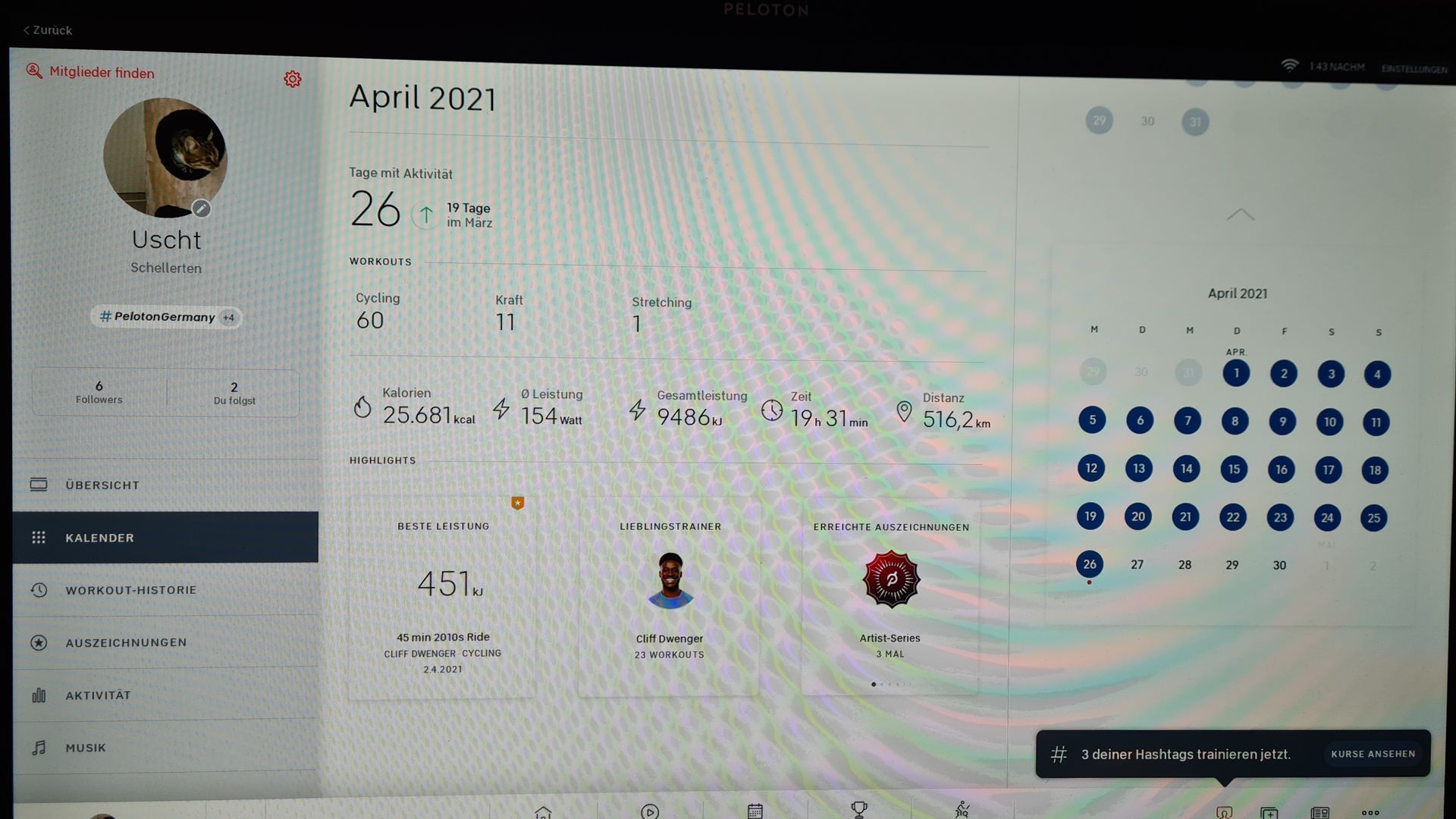 Wie für mich üblich, habe ich anfangs ein wenig übertrieben und kurzfristig Schmerzen im rechten Knie bekommen. Durch ein paar Tage ohne Cycling Classes hab ich das aber schnell wieder in den Griff bekommen und das Fahrrad Pensum ein wenig nach unten angepasst.